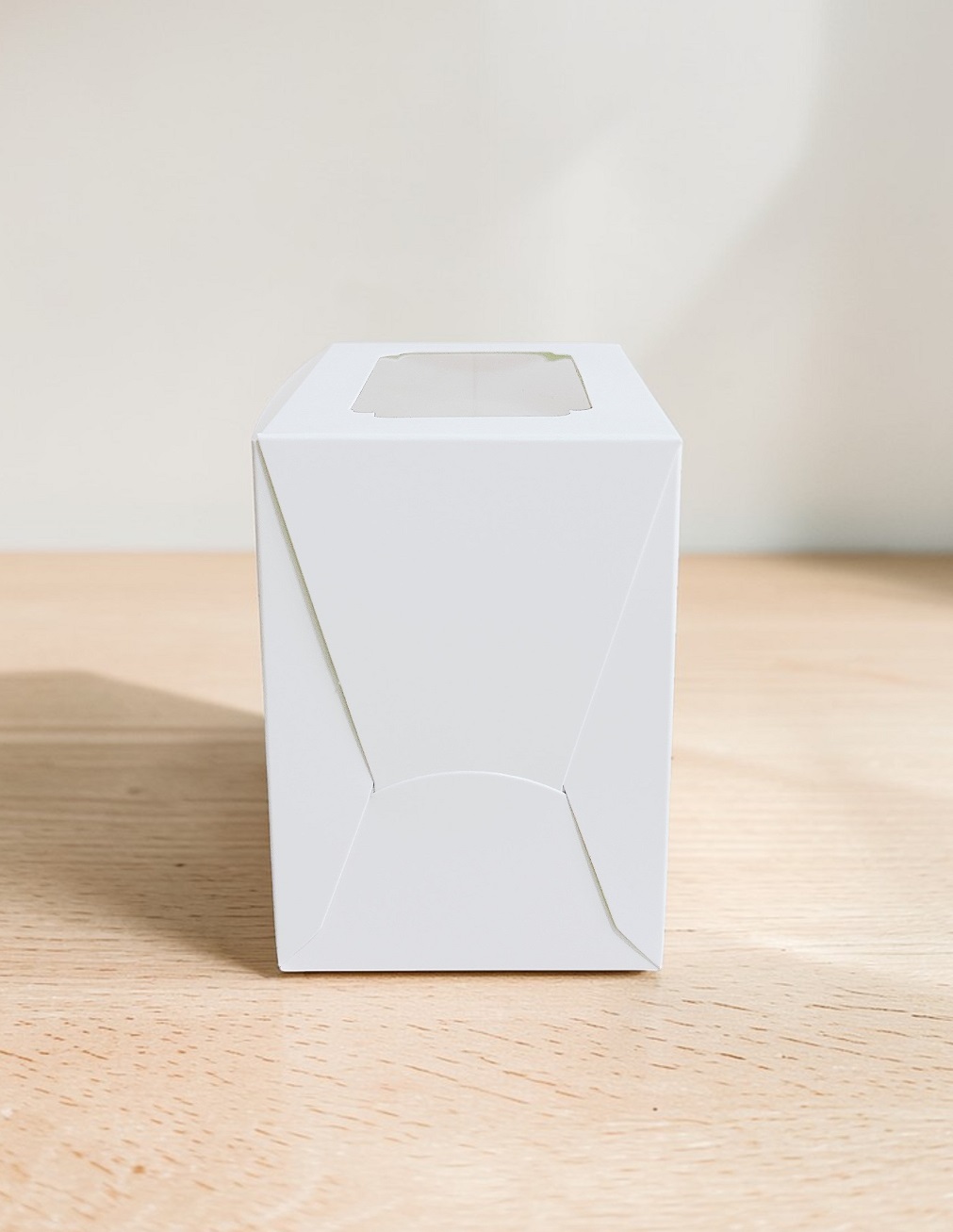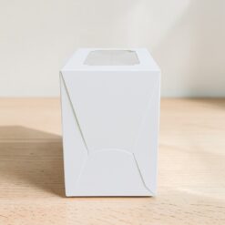 กล่องเค้ก 1 ปอนด์ กระดาษขาว กล่องสูง 19 ซม. เจาะหน้าต่างยาวจากบนกล่องลงมาจนถึงด้านหน้ากล่องแบบวีเชฟ ติดฟิล์มใสแบบหนา เนื้อกระดาษละเอียดอย่างดี สามารถใส่ขนมเค้กหรือขนมที่มีความสูงมากเป็นพิเศษ สามารถโชว์ขนม สิ่งของที่อยู่ในกล่องได้อย่างชัดเจน กล่องประกอบขึ้นรูปง่าย แข็งแรงรับน้ำหนักได้มาก ในหนึ่งแพคมีกล่อง 10 ใบ